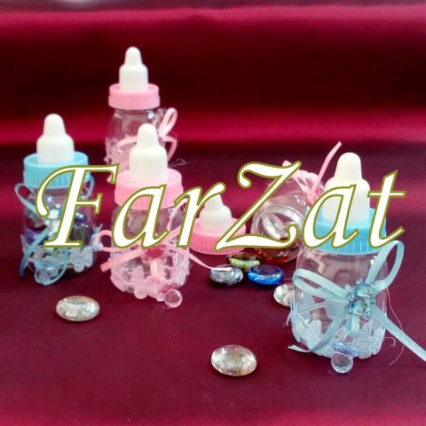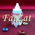 Marturii botez sub forma de biberon, realizat din plastic transparent cu aplicatie pe margine (model de carucior), fundita din satin.