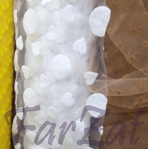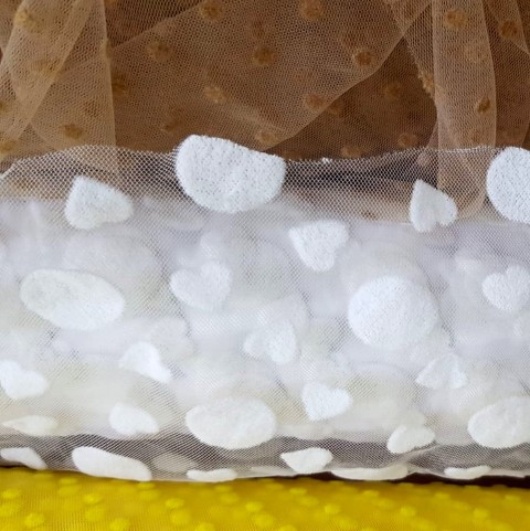 Tesatura tiul cu buline si inimioare este ideala pentru realizarea articolelor vestimentare (rochii, fuste), decoratiuni.